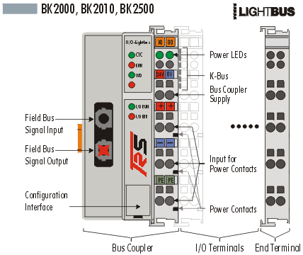 Product Description The BK2000 and BK2010 bus couplers connect the TRS-Lightbus system to the electronic terminal blocks, which can be expanded in modular fashion. One unit consists of one bus coupler, any number of up to 64 terminals and one end terminal. The BK2010 economy variant permits particularly economical creation of peripheral interfacing connections. Up to 64 digital input/output terminals can be connected. The bus coupler recognises the connected terminals and automatically generates the affiliations of the inputs/outputs to the bytes of the process image. The first input/output signal is inserted in the first bit of one byte (LSB), beginning from the left. The bus coupler inserts further signals in this byte. Inputs and output are clearly separated. The bus coupler automatically begins a further byte if the number of inputs or outputs exceeds 8 bits. The TRS-Lightbus System is a rapid and safe serial field bus system. The TRS-Lightbus has a ring structure, and up to 254 stations can be operated